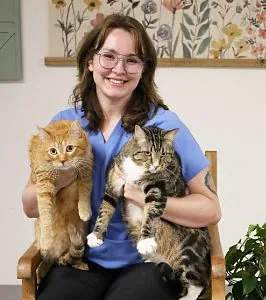Emerson joined our team in 2024 after working in customer service. Emerson’s passion for animals and wanting to offer top level customer service shine here every day. Learning more about Veterinary Medicine and seeing all the cute pets keeps Em coming back each day! Four cats, a beta fish, a crested gecko, and a few human roommates round out Emerson’s home. Em is a very creative person who enjoys all kinds of crafts and camping.